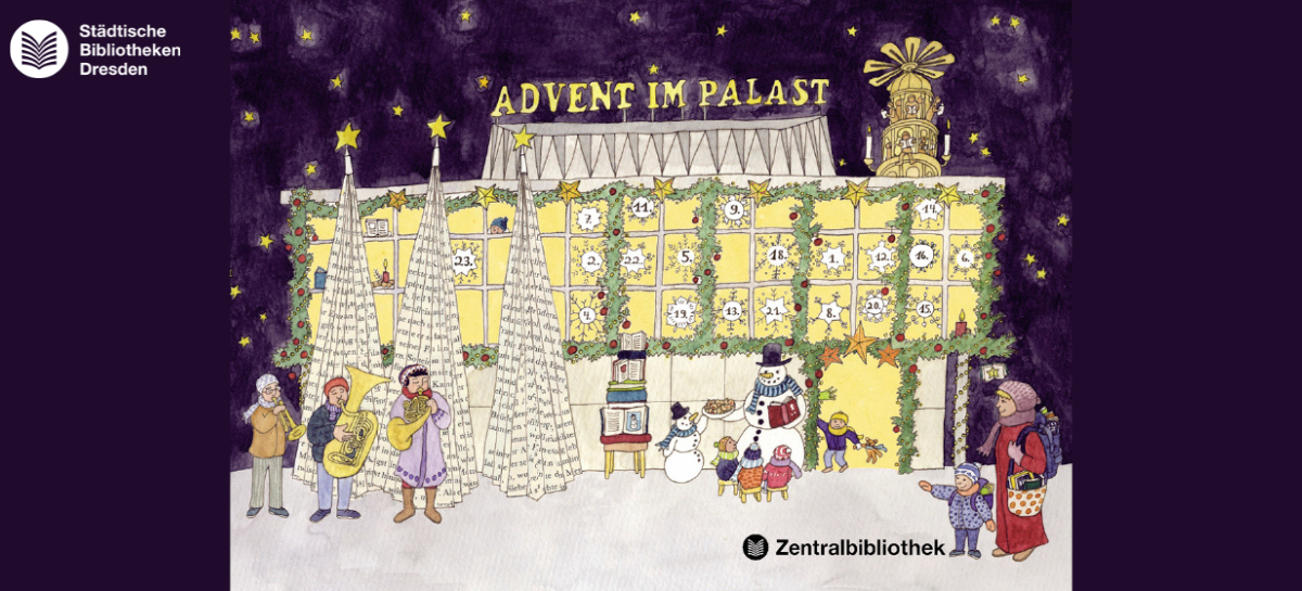 Die Städtischen Bibliotheken Dresden laden Sie herzlich ein, die Vorfreude auf Weihnachten zu genießen. Mit Lesungen, Mitmach-Angeboten und stimmungsvollen Konzerten stimmen wir uns mit Ihnen bei "Advent im Palast" auf die besinnliche weihnachtliche Zeit ein. In der letzten Novemberwoche finden Sie alle Advents- und Weihnachtsveranstaltungen in den Städtischen Bibliotheken Dresden auf unserer Webseite.