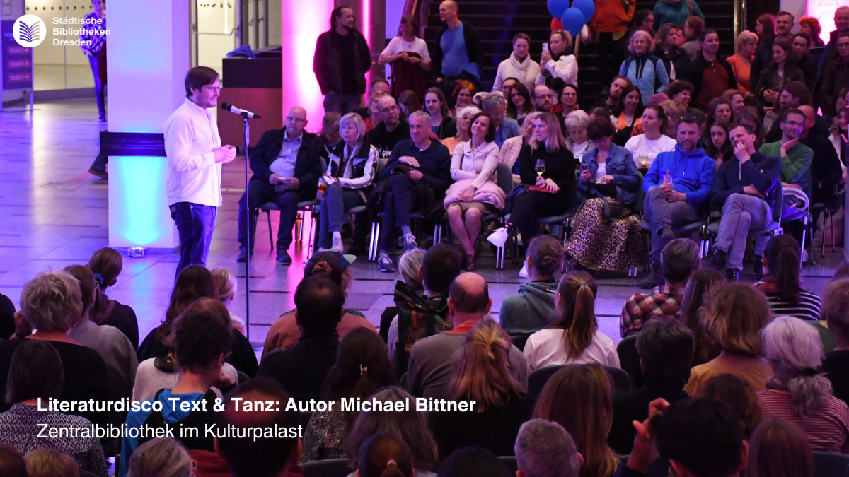 Ein besonderes Highlight war die Literaturdisco „Text & Tanz“ in der Zentralbibliothek im Kulturpalast. Dort sorgten humorvolle Texte bekannter Autor*innen der Dresdner Lesebühne Saxroyal und der Berliner Reformbühne Heim & Welt im Wechsel mit funkigen Beats von Autor und DJ Max Rademann bis spät in die Nacht für beste Stimmung.