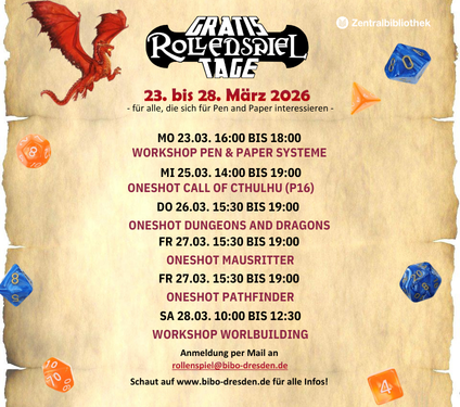 Vom 23. bis 28. März könnt ihr Pen-and-Paper-Rollenspiele als Workshop und Oneshot bei den kostenlosen Rollenspiel-Tagen in der Zentralbibliothek im Kulturpalast Dresden kennenlernen oder gemeinsam spielen. Die Teilnahme ist gratis, eine Anmeldung ist erforderlich.