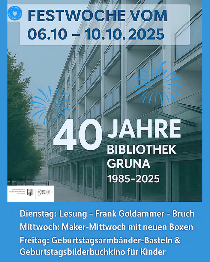 Seit 40 Jahren ist die Bibliothek Gruna ein Ort zum Stöbern, Lesen, Lernen und Begegnen. Dieses Jubiläum möchte das Bibliotheks-Team gemeinsam mit Euch feiern! Alle Interessierten sind herzlich eingeladen zum Basteln, Rätseln und Mitmachen. Den feierlichen Auftakt zum Jubiläum machte die Lesung mit Frank Goldammer am 7. Oktober 2025. Bis auf den letzten Platz war die Abendveranstaltung belegt, als der Dresdner Autor seinen neuen Roman "Bruch - Am Abgrund" vorstellte.