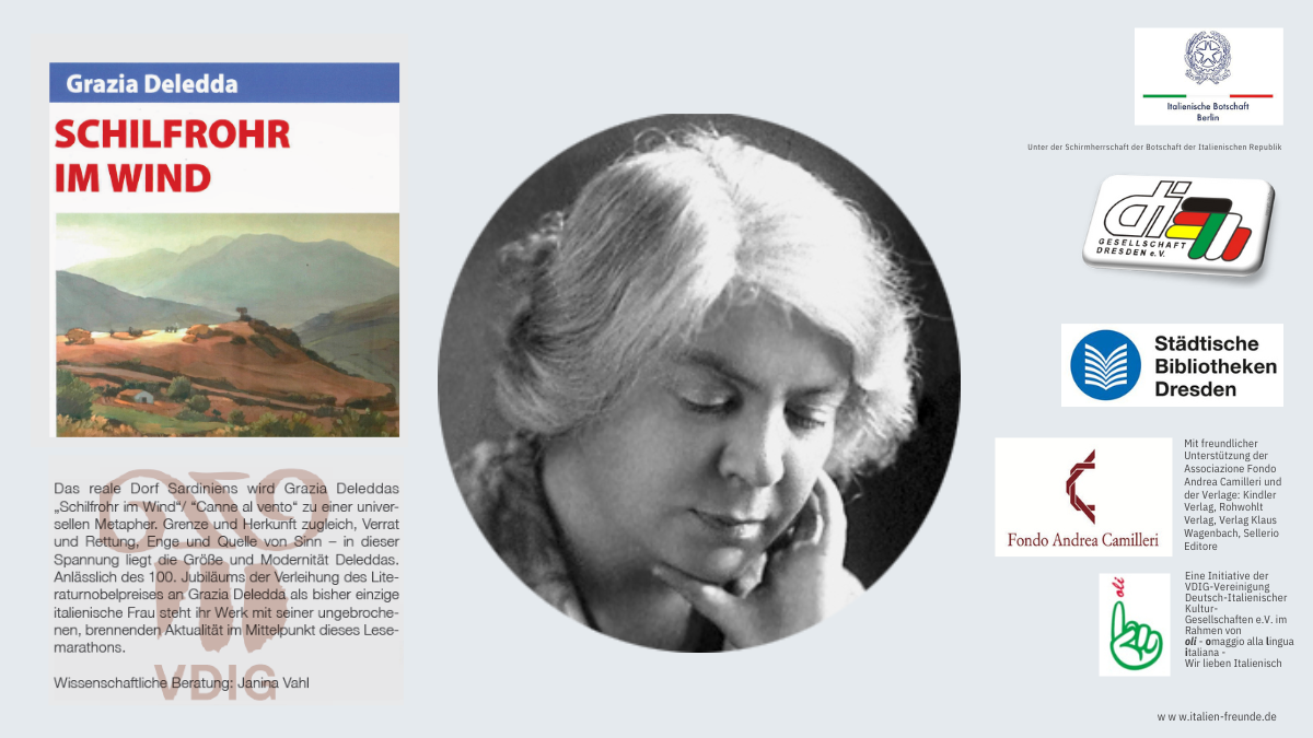 Grazia Deledda steht im Fokus der mittlerweile 12. Ausgabe des VDIG-Lesemarathons. Das 100. Jubiläum der Verleihung des Literaturnobelpreises an die Schriftstellerin ist der Anlass, sich der Autorin und der sardischen Lebenswelt zu näheren und sie (wieder) zu entdecken. Im Mittelpunkt wird "Schilfrohr im Wind - Canne al vento" stehen.